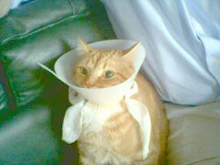 we think aj may have started picking at his stitches (we haven’t seen him, but the ends look longer), so joe stopped by the vet and picked up a cone just in case. we tried it on him the other night, and he kept backing up until he ran into the couch as if he was thinking that he could back away from it. he was probably thinking, why won’t it go away?? this picture is classic.